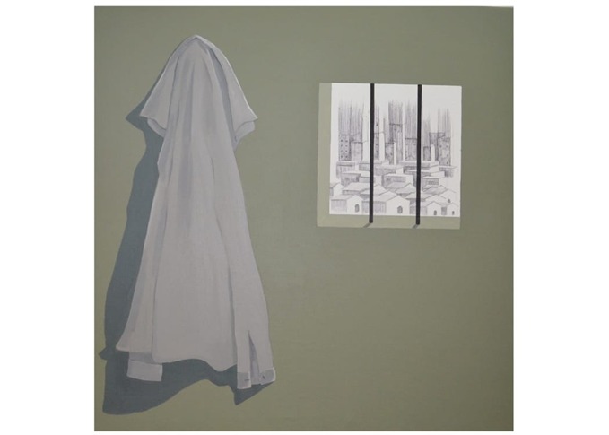 The shirt suggests a trace of life, a silent witness to the person who once wore it. The bars across the city view evoke the tension between inner isolation and the unreachable outer world. The subtle, restrained color palette enhances the feeling of calm stillness, while also carrying an undertone of melancholy.